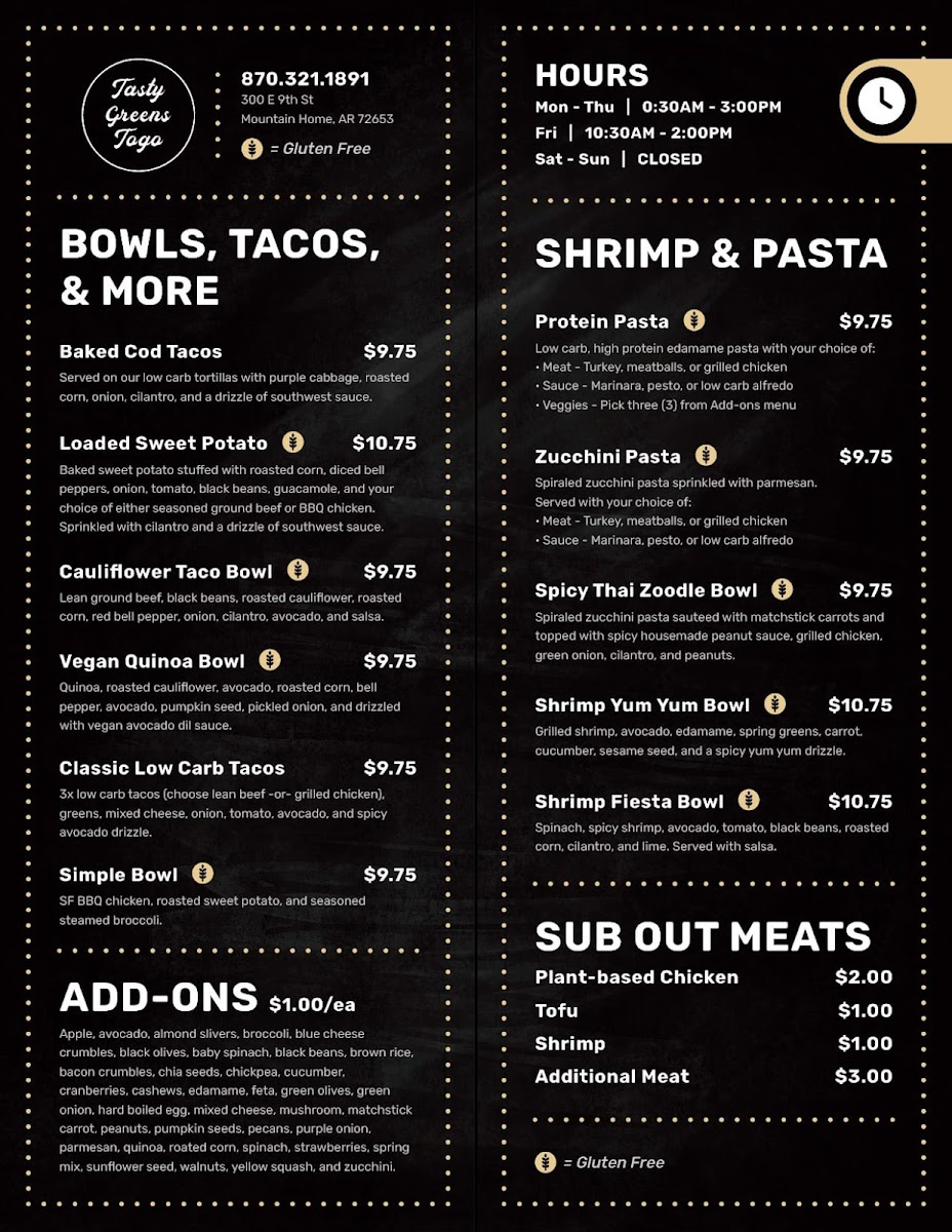 If you're in the mood for a healthy, delicious bite, the Tasty Greens Togo Menu is where you want to be. Located at 300 E 9th St, Mountain Home, AR, this spot serves up an incredible variety of fresh, flavorful dishes that will leave you feeling satisfied and energized. Whether you're craving a crisp salad, a hearty grain bowl, or a tasty wrap, there's something for everyone here.